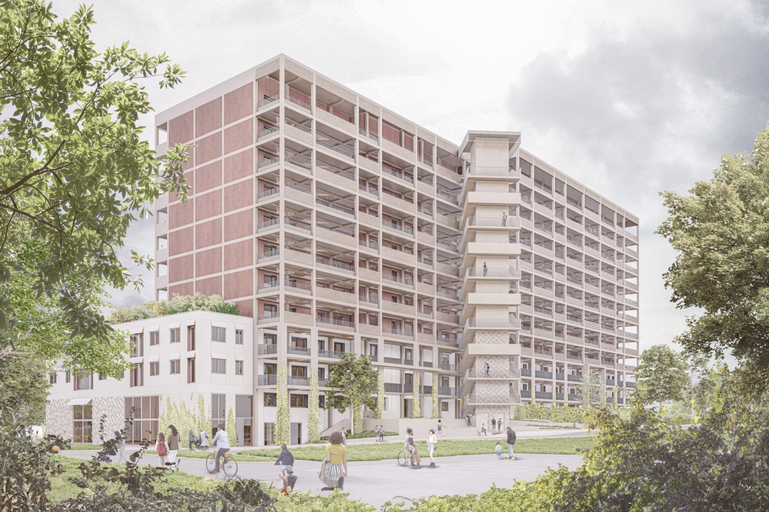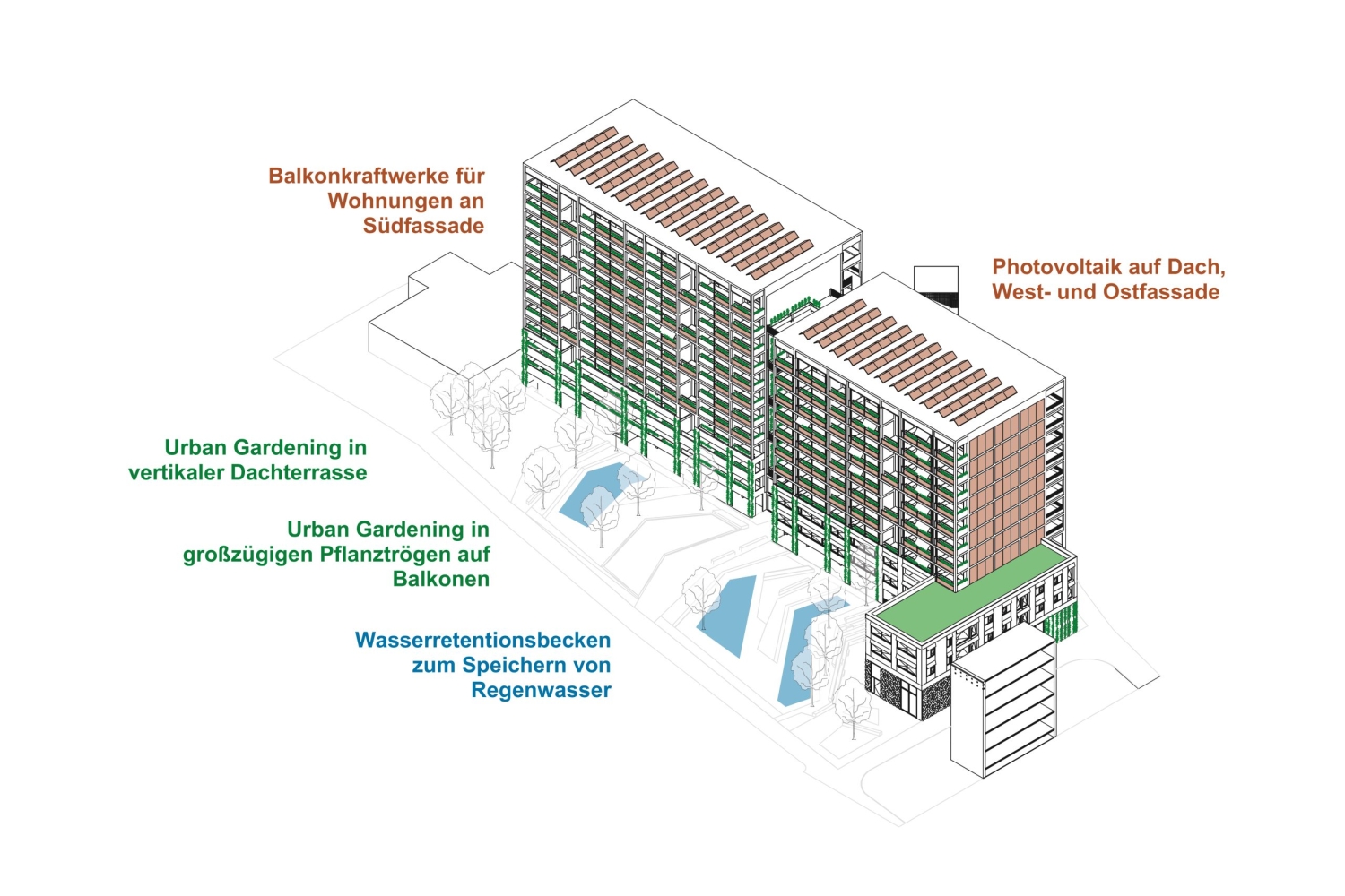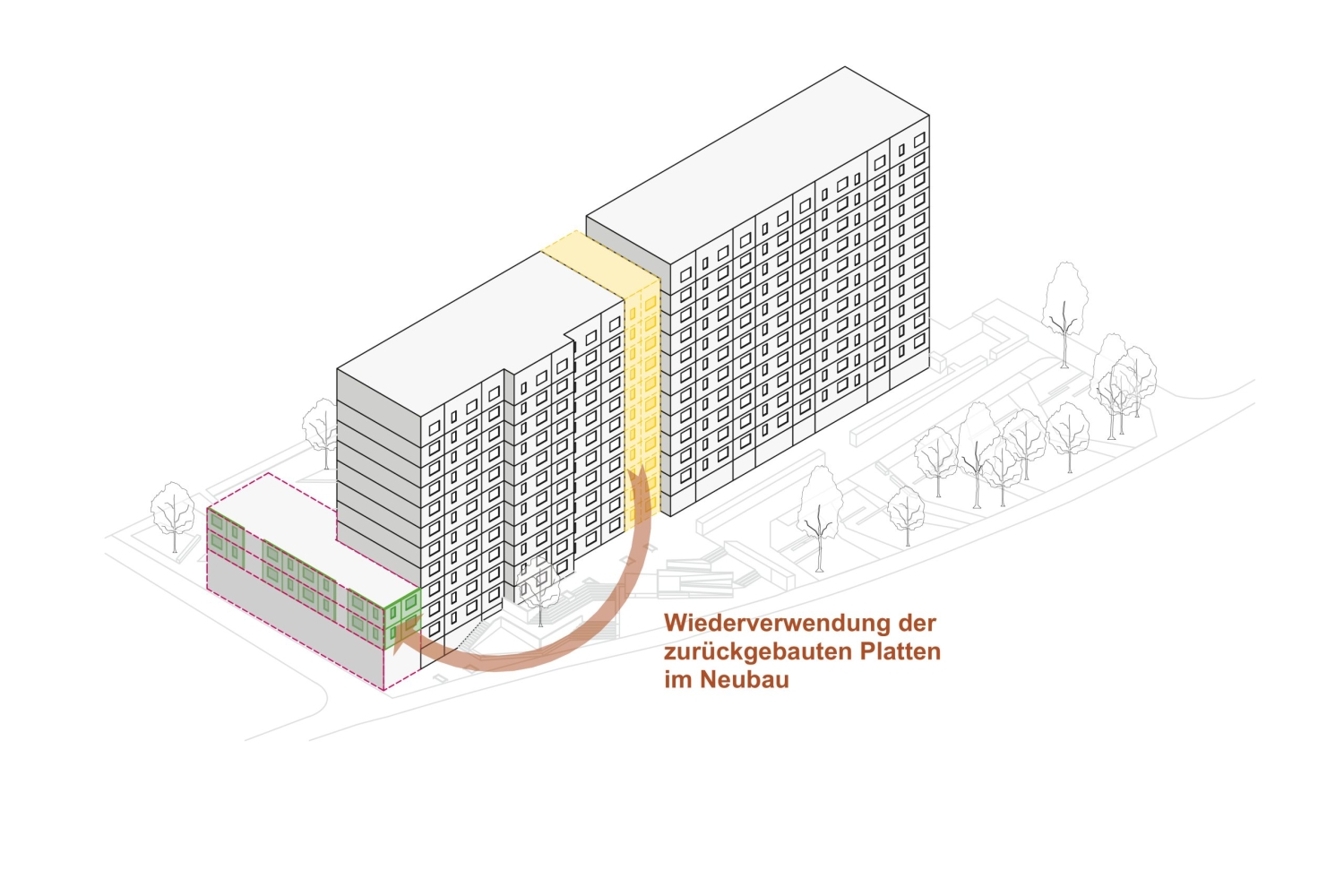 Das Entwurfskonzept transformiert das Typenhaus WBS70 in ein lebendiges und vielschichtiges Zentrum für Erfurts Herrenberg. Das herausragende und von weitem sichtbare Gebäude, wird saniert und zum neuen sozialen Treffpunkt für die Bewohner und das ganze umliegende Herrenberg-Quartier umgewandelt. Die neue Architektur organisiert verschiedene Öffentlichkeiten und gibt den Bewohnern einen Ort des Zusammenlebens. Die bisher anonyme Scheibe mit monotoner Lochfassade wird zu einem vielschichtigen Bauwerk welches sich als ausdifferenzierter Baukörper selbstbewusst präsentiert. Dabei werden verschiedene neue Elemente angefügt, welche den Bestandsbau brandschutztechnisch und nachhaltig aufrüsten und damit für Bewohner und Umwelt zu einem wertvollen und zukunftsfähigen Bau weiterentwickeln.