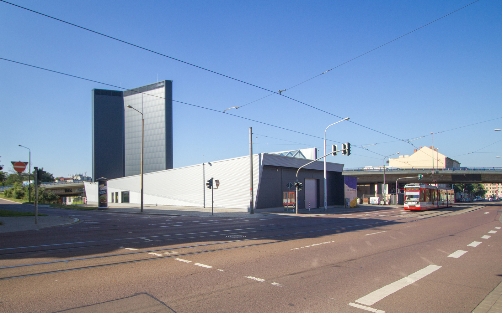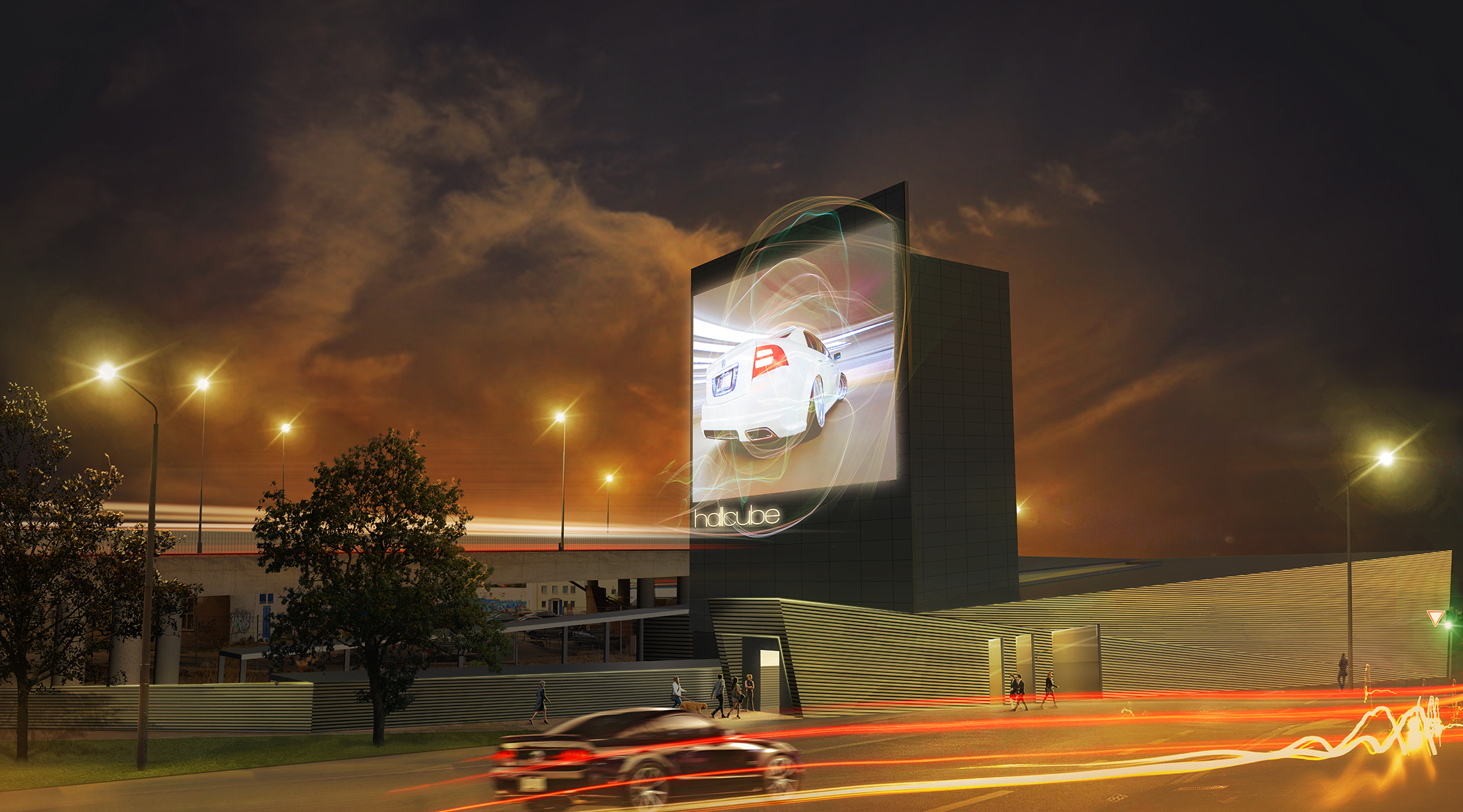 Direkt an einer der am stärksten befahrenen Straßen der Stadt entsteht ein 22 Meter hoher Werbeturm mit den wahrscheinlich größten LED-Werbeflächen Deutschlands. So verrückt wie diese Idee auch anfangs geklungen haben mag, so spannend ist das Projekt geworden. Eine spektakuläre Stahlkonstruktion, extrem nah an der Straße errichtet, reckt sich an der Hochstraße vorbei und trägt die beiden jeweils 16 x 10 Meter großen „Bildschirme“. Ergänzt wird dieses Bauwerk durch eine nicht minder interessante, angegliederte 40 Meter lange Ausstellungshalle für Oldtimer.