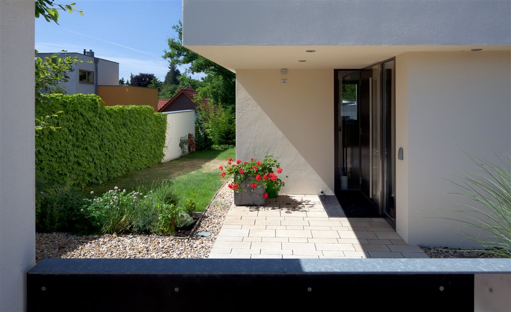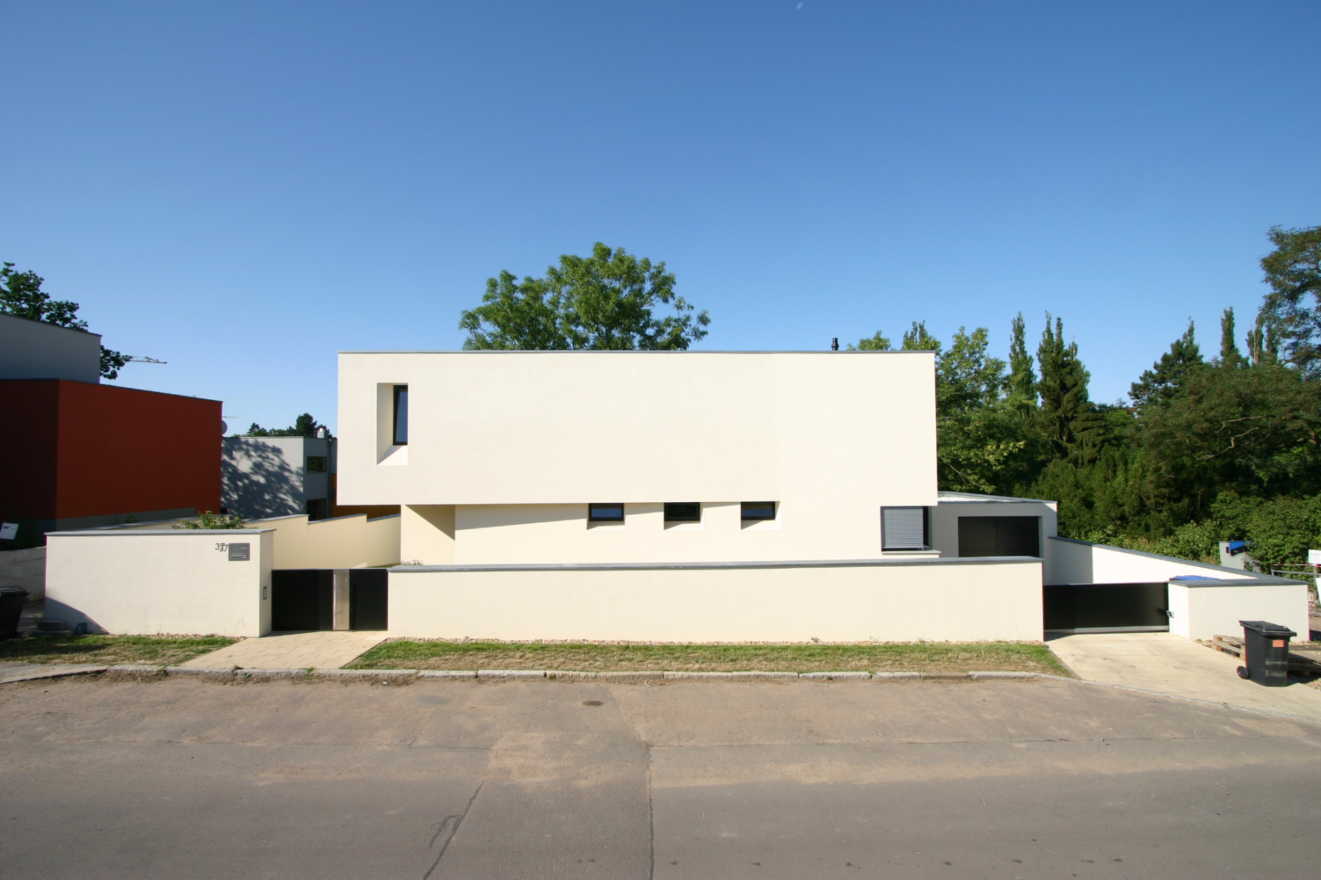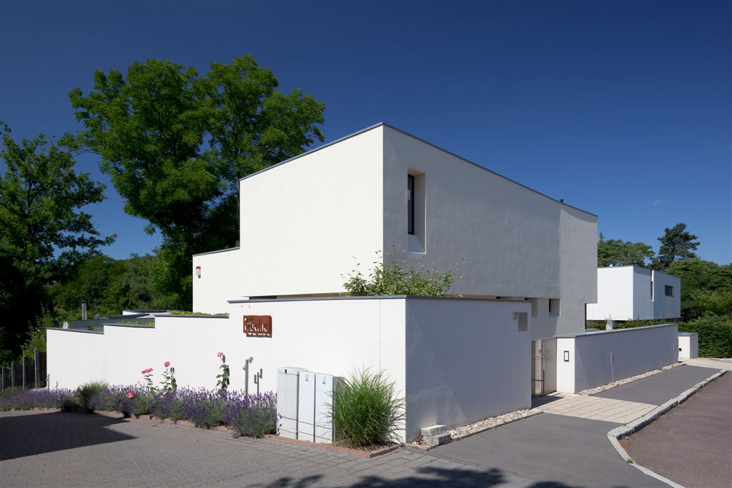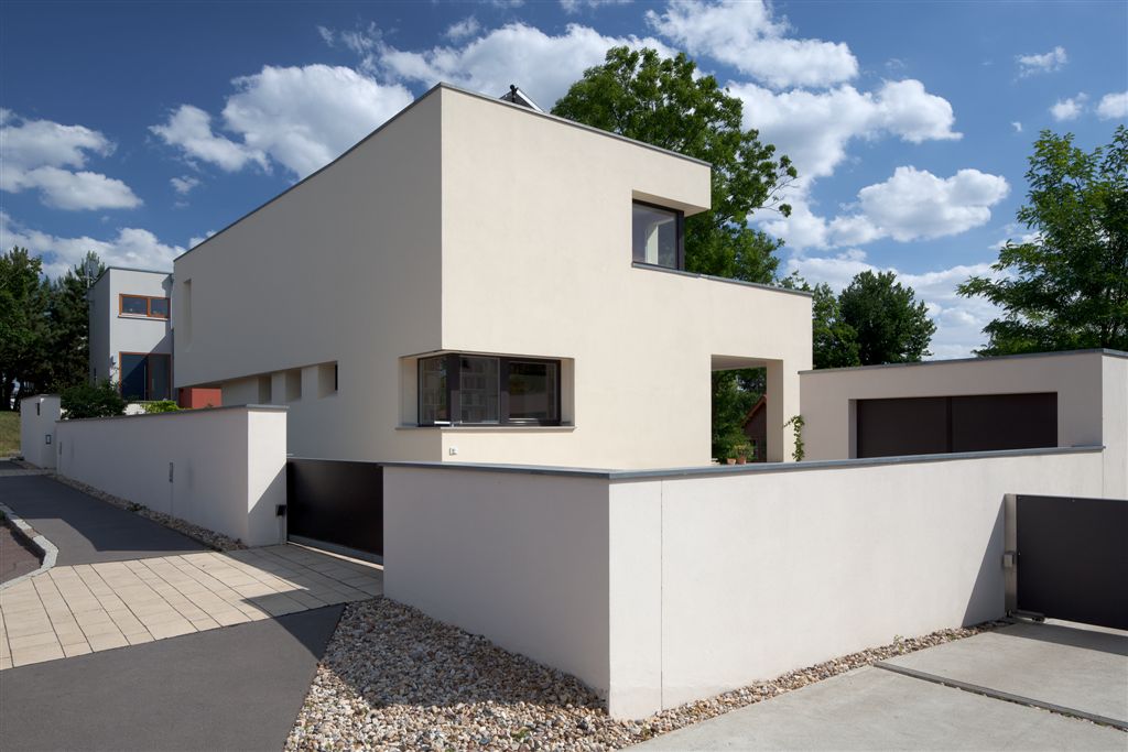 Quer zum Hang, entlang der Straße, legt sich das Wohnhaus auf den Hang. Wie in einen Monolithen fräsen sich Eingang und Öffnungen in den Baukörper: Spannungsgeladen und geheimnisvoll zur Straße hin; offen und dynamisch zum Garten. Der Grundriss lebt von der parallelen Bewegung zu den Hanglinien und den großen Raumdiagonalen. Eine kleine Loggia, die Gartenterrasse und die große Dachterrasse erweitern die Innenräume und bieten Sitzplätze mit unterschiedlichem Charakter an.
