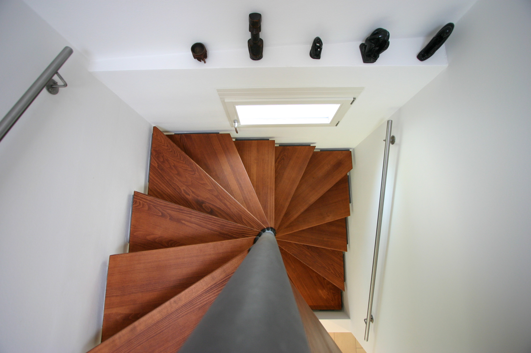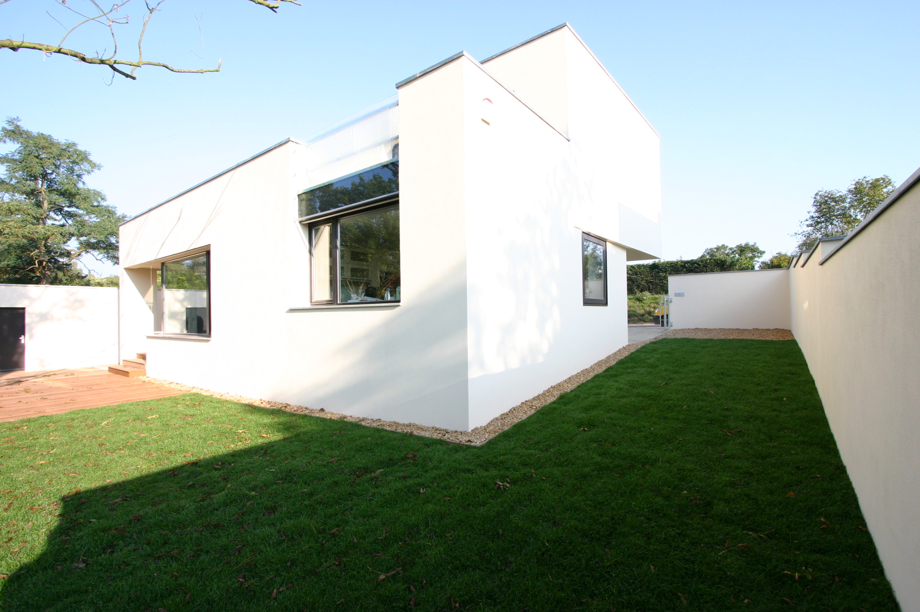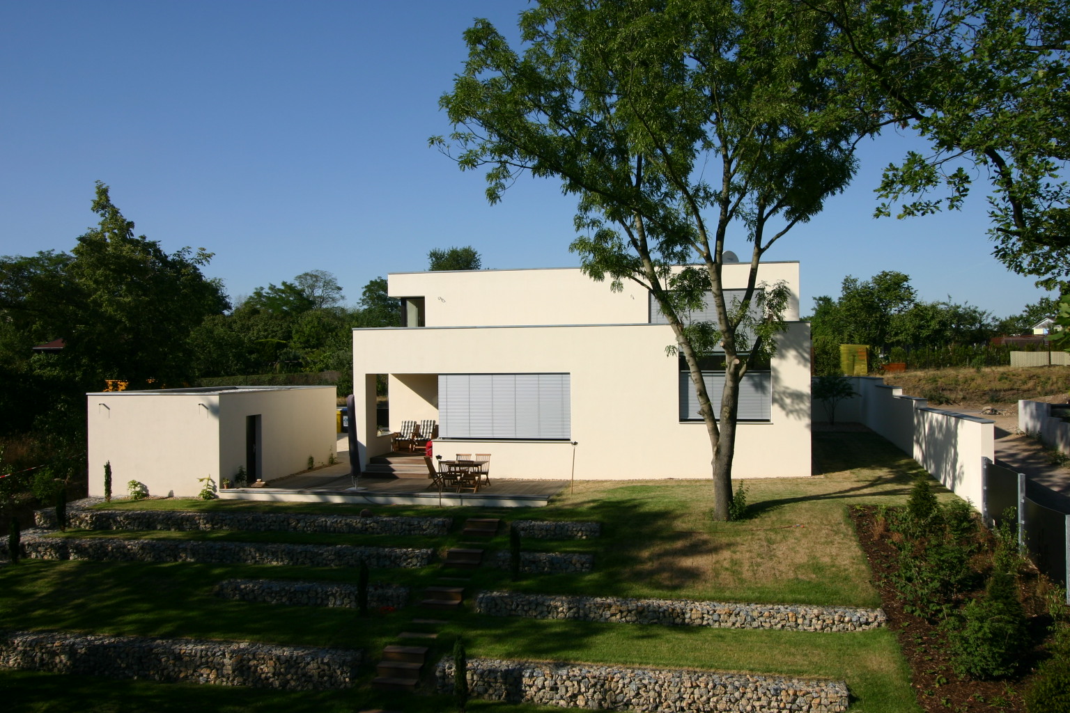 Quer zum Hang, entlang der Straße, legt sich das Wohnhaus auf den Hang. Wie in einen Monolithen fräsen sich Eingang und Öffnungen in den Baukörper: Spannungsgeladen und geheimnisvoll zur Straße hin; offen und dynamisch zum Garten. Der Grundriss lebt von der parallelen Bewegung zu den Hanglinien und den großen Raumdiagonalen. Eine kleine Loggia, die Gartenterrasse und die große Dachterrasse erweitern die Innenräume und bieten Sitzplätze mit unterschiedlichem Charakter an.