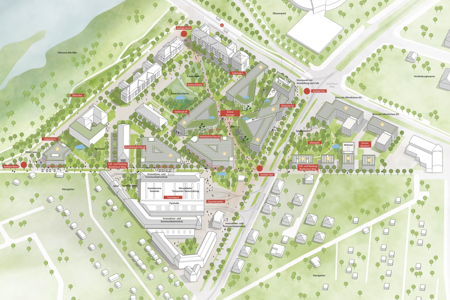 Die Neubauten fassen den historischen Kasernenplatz räumlich und schaffen durch gezielte Staffelung und versetzte Baukörper eine offene, durchlässige Struktur. Die Gebäude kombinieren robuste Außenfassaden mit begrünten Innenbereichen. Entlang der Grünen Passage entstehen geschützte Arbeits- und Aufenthaltszonen mit hoher mikroklimatischer Qualität.
