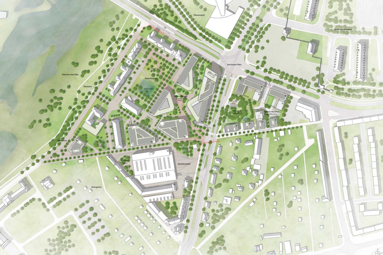 Ein durchgängiges Freiraumkonzept verbindet grüne Rückzugsorte, öffentliche Wege und neue Nutzungsangebote miteinander. So entsteht ein lebendiger, offener Ort für moderne Arbeitswelten, der den Stadtraum aufwertet und neue Verbindungen schafft.