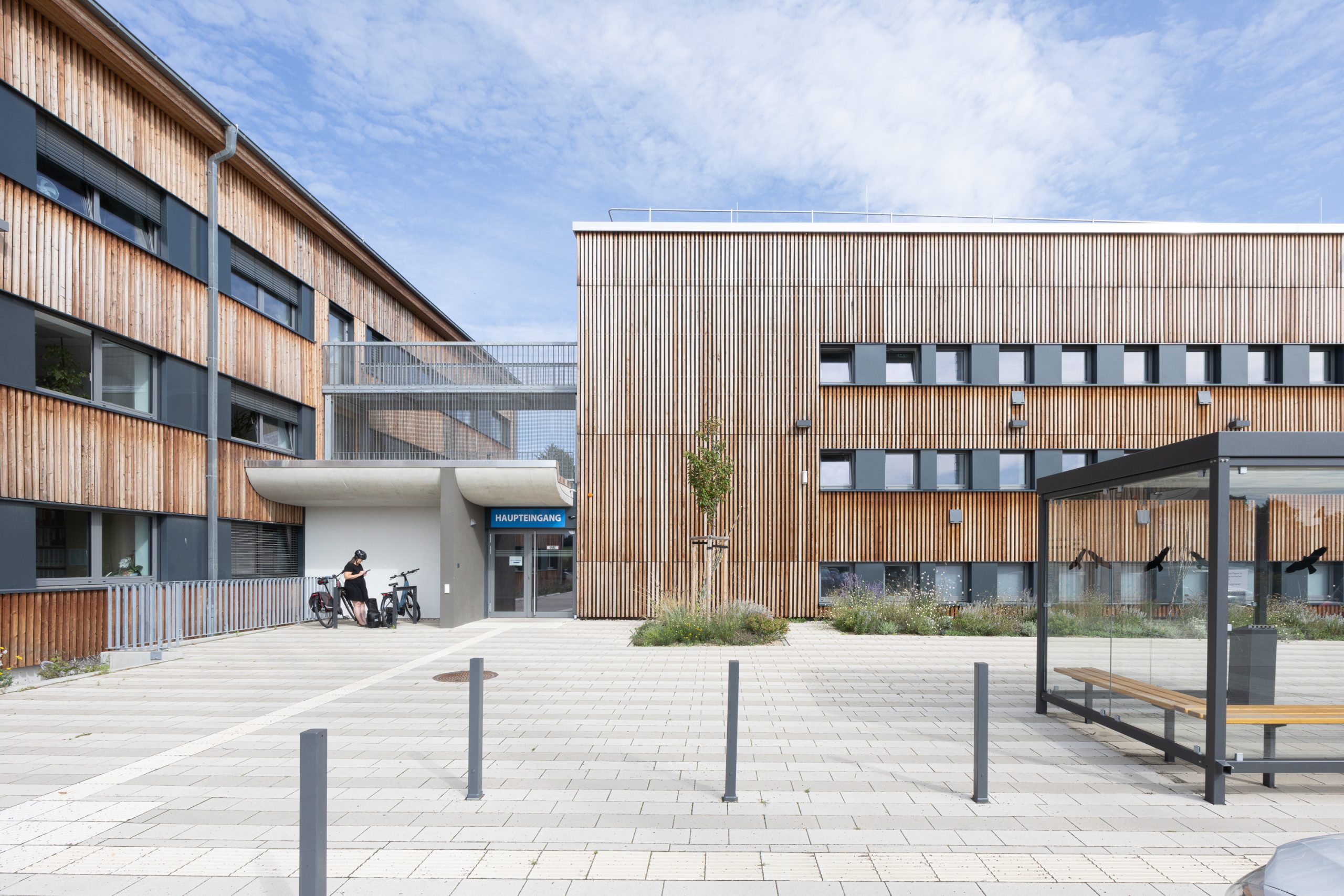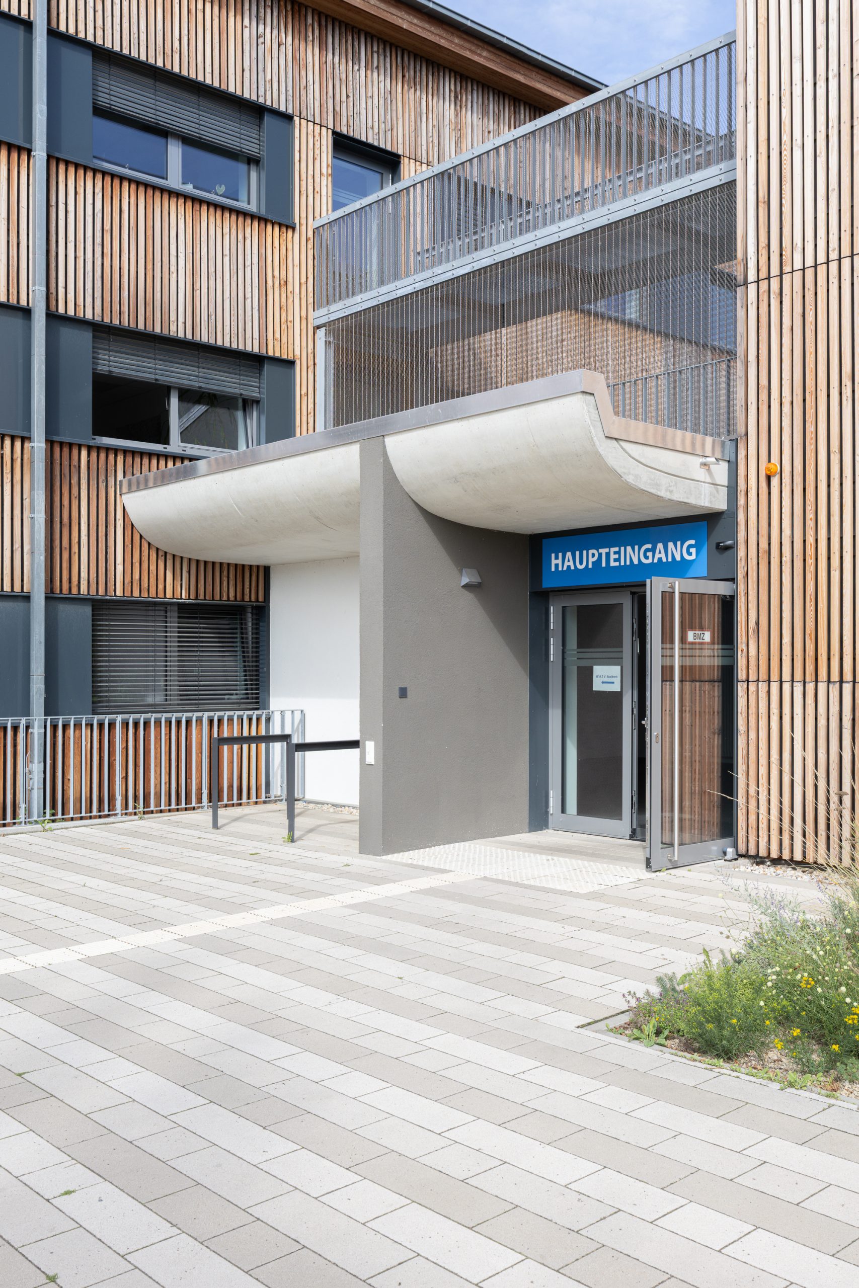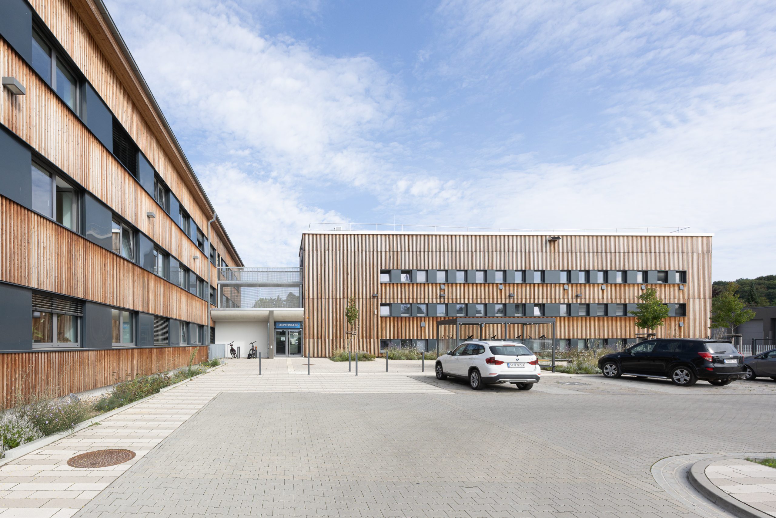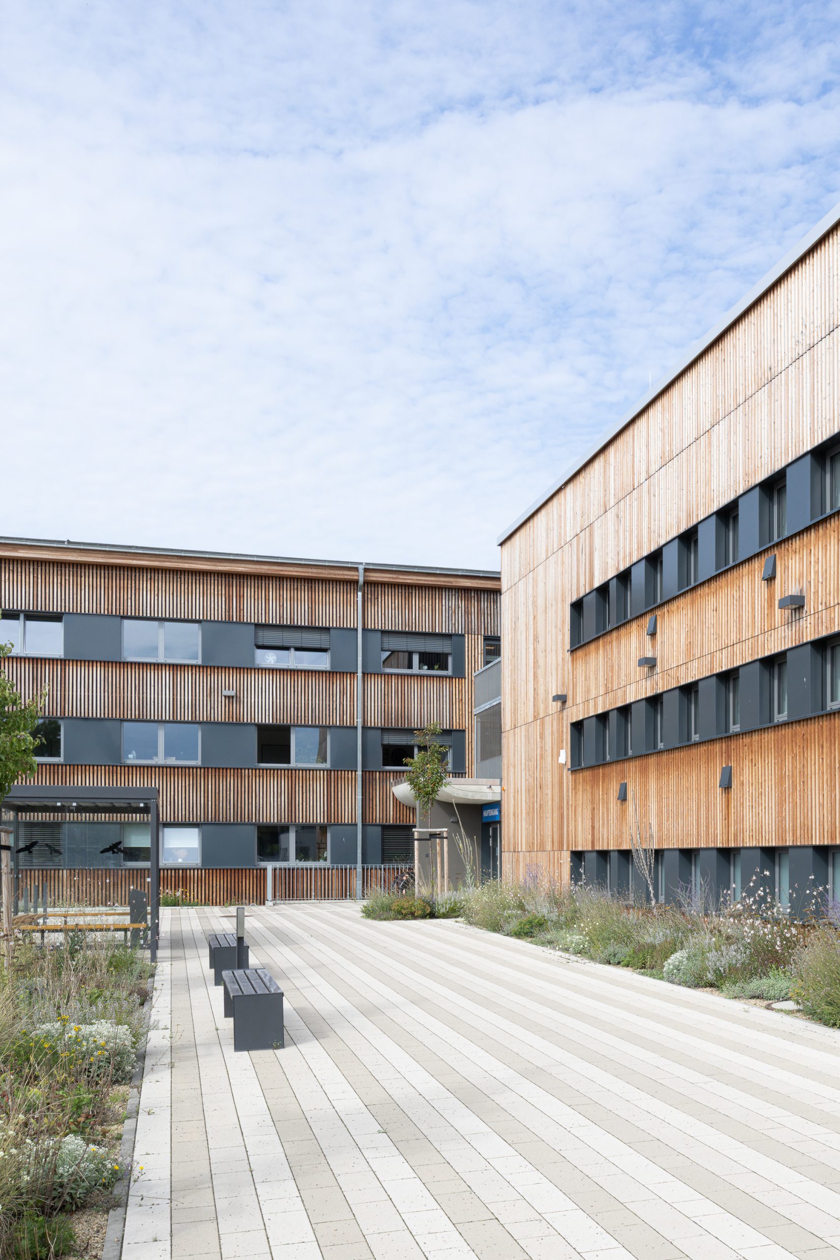 Die gesamte Gebäudegruppe erhielt durch eine einheitliche Holz-Vorhangfassade, eine neue ästhetische Einheit. Diese Maßnahme schafft nicht nur eine harmonische Ensemblewirkung, sondern unterstreicht auch das Engagement des Verbandes für nachhaltiges Bauen.