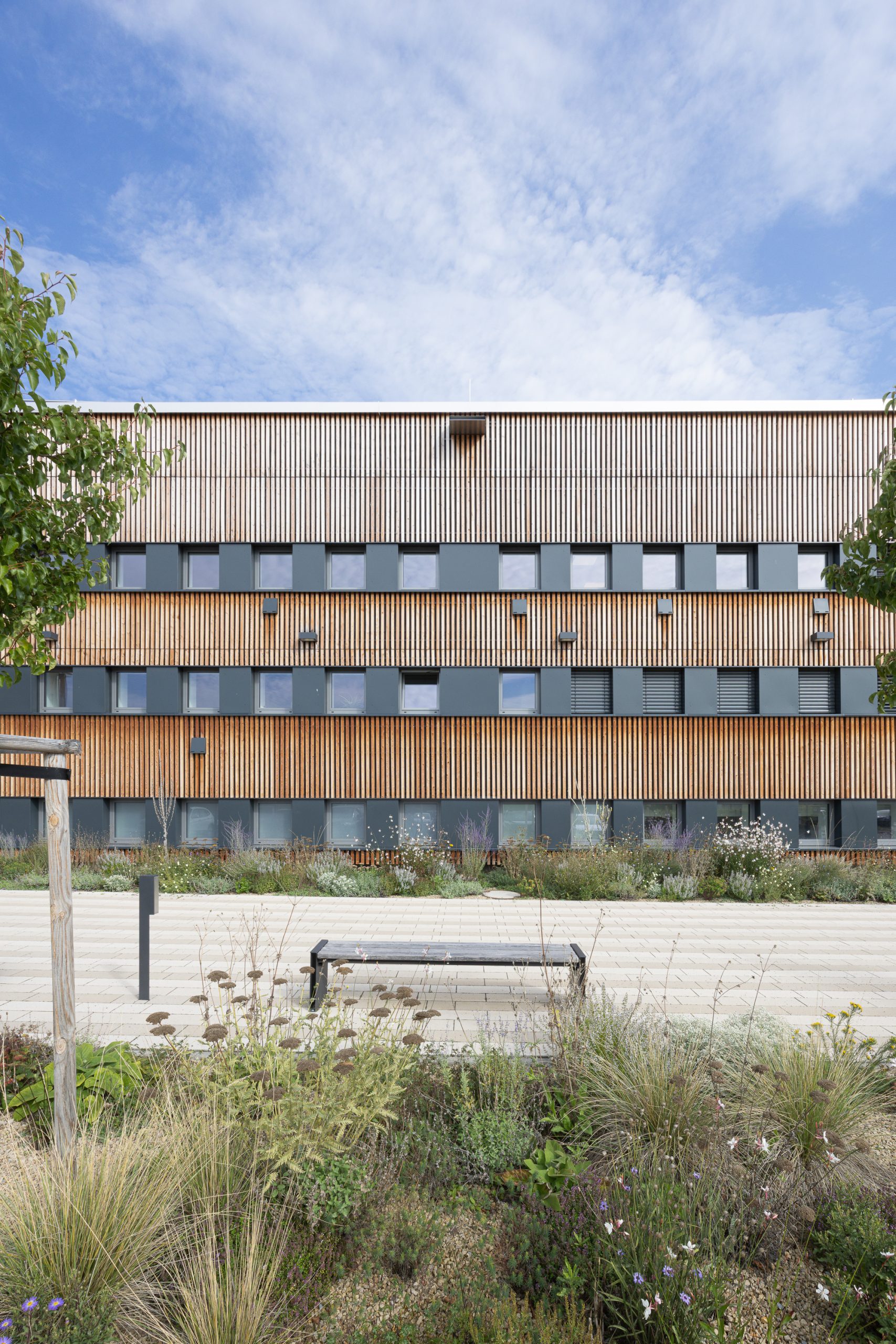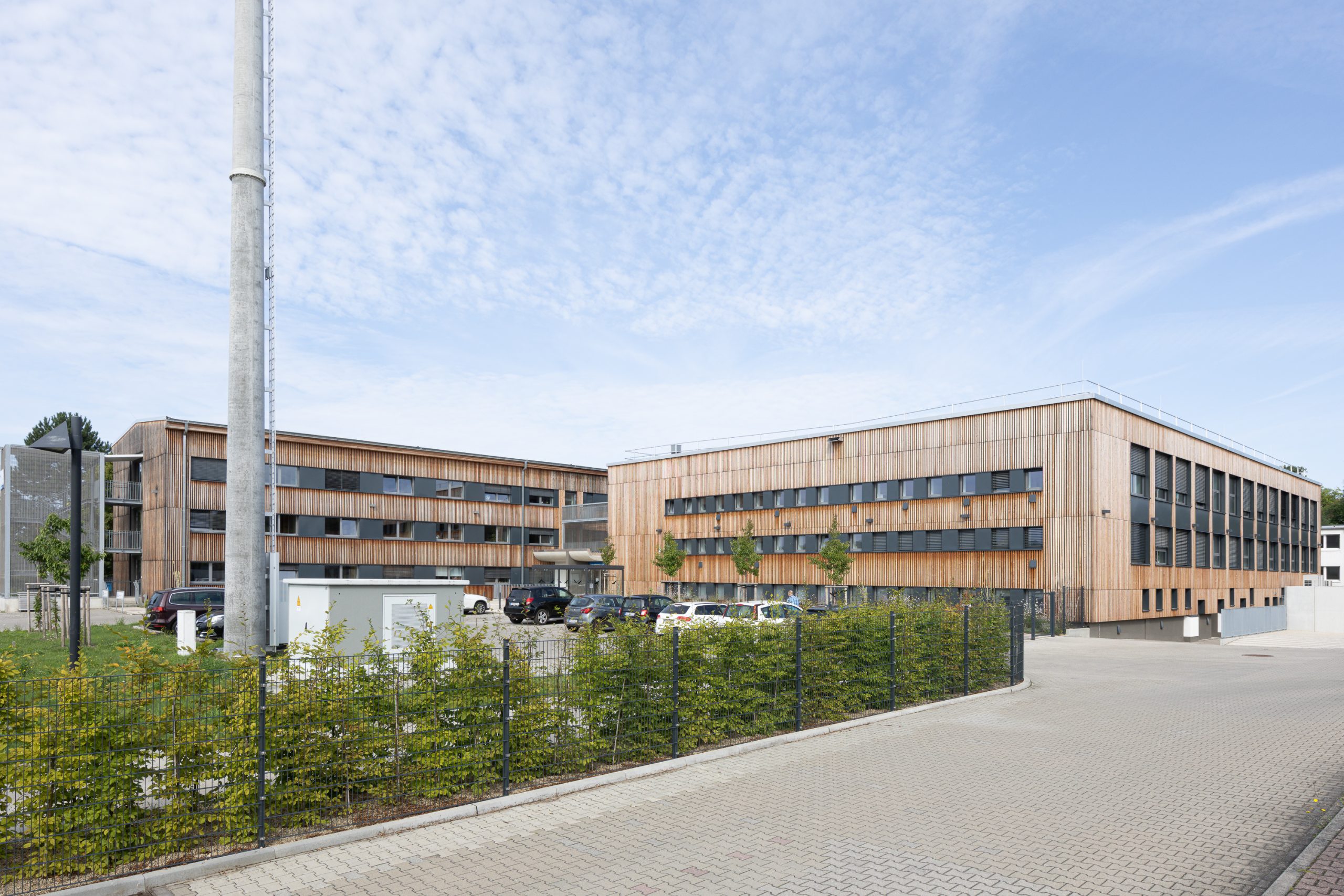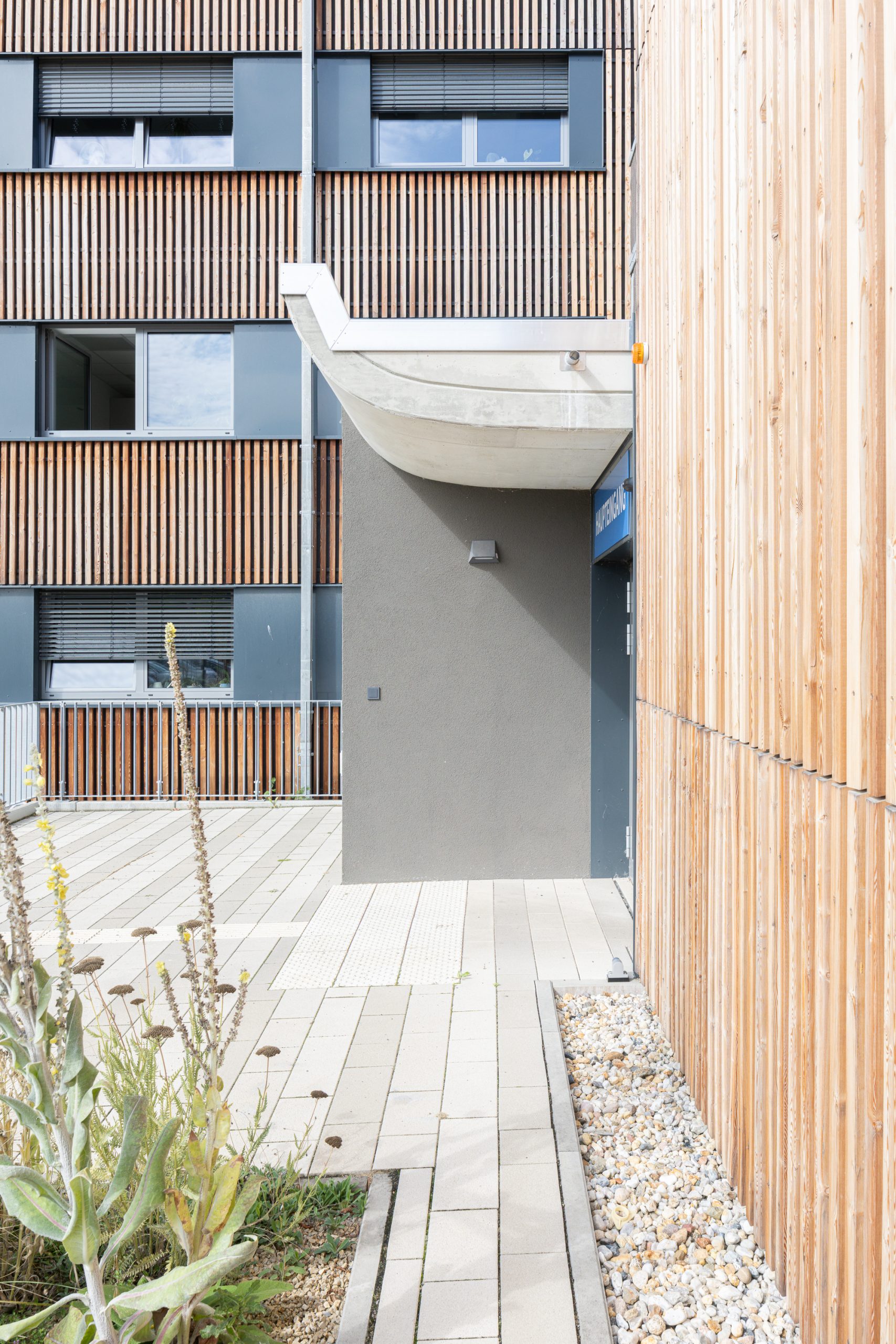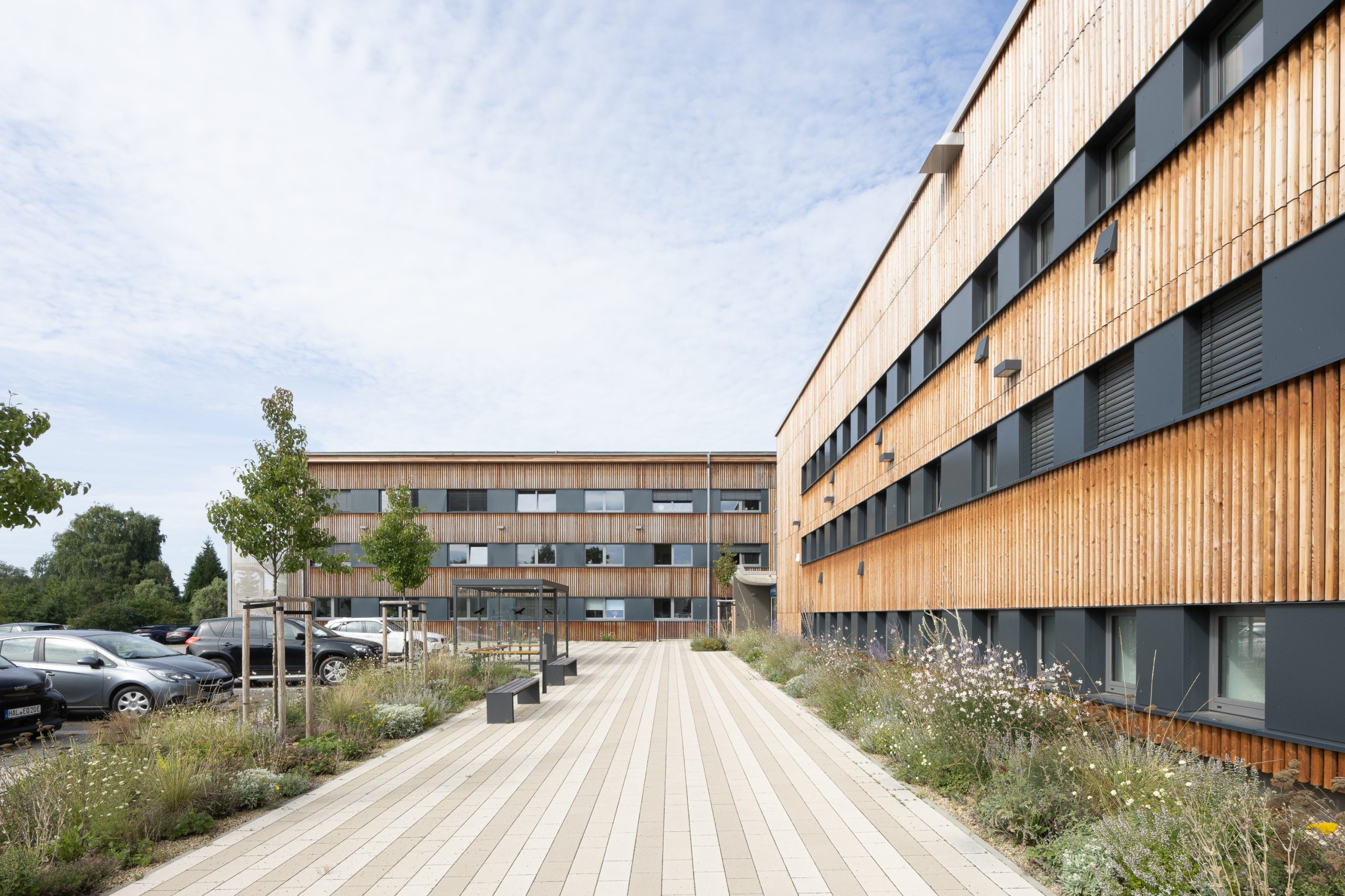 Die gesamte Gebäudegruppe erhielt durch eine einheitliche Holz-Vorhangfassade, eine neue ästhetische Einheit. Diese Maßnahme schafft nicht nur eine harmonische Ensemblewirkung, sondern unterstreicht auch das Engagement des Verbandes für nachhaltiges Bauen.